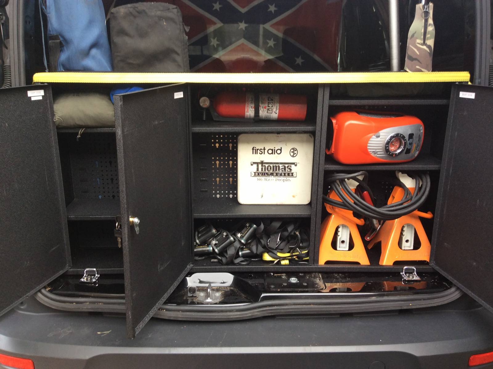 Not easily seen is the aluminum floor jack (silver handle on right), black bag on left is lock-out tools & blue bag is my camping chair