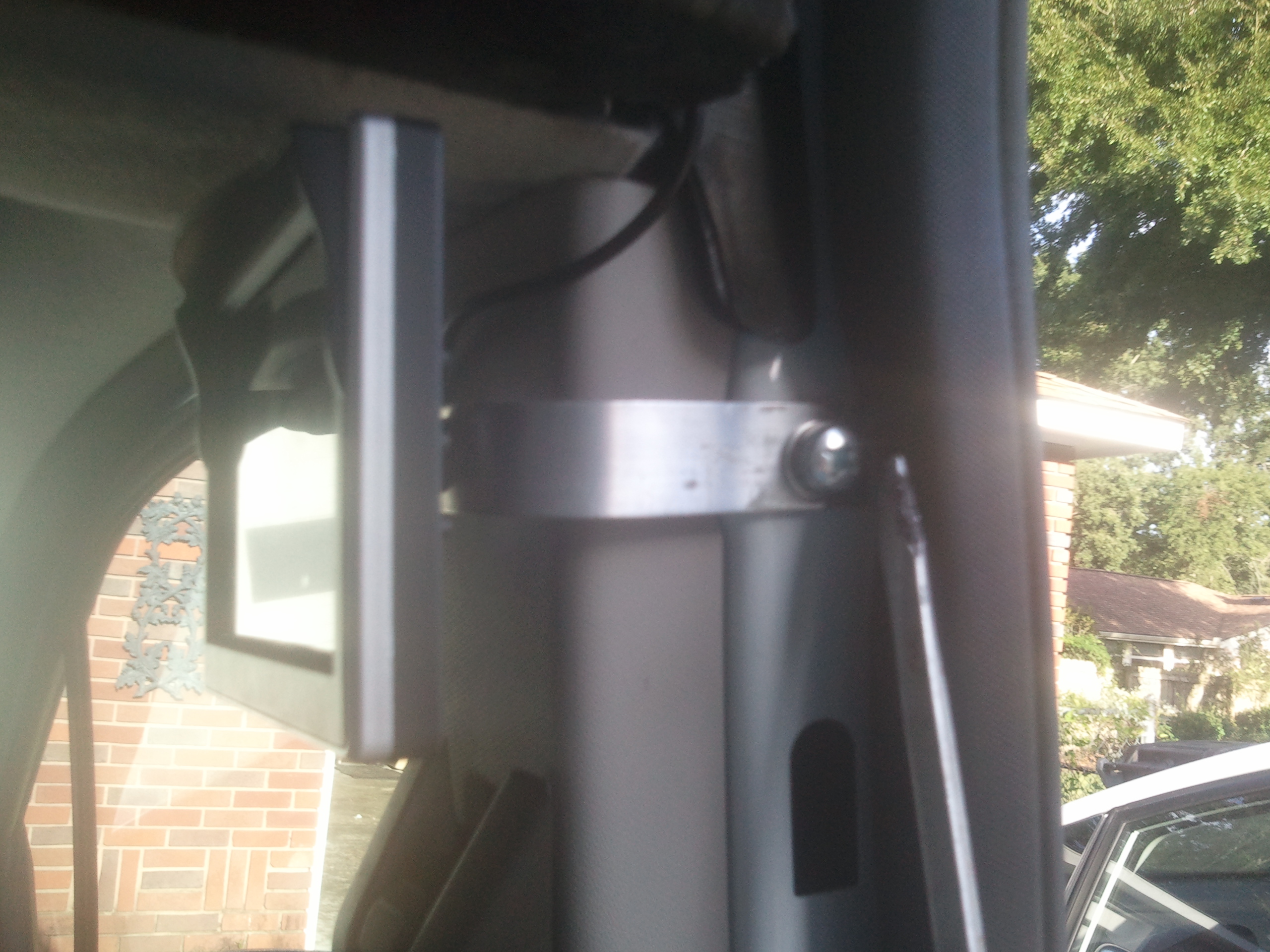 Monitor installed on B pillar on the passenger side using existing mounting hole that had to be tapped.