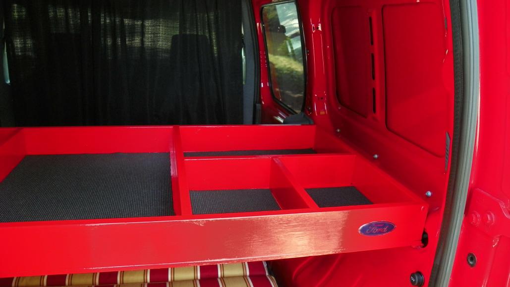 Shelf i designed and built. It has proven most useful for going to the store or camping. It is very strong. I have sat in it. The dividers help organize. It is easily removable.