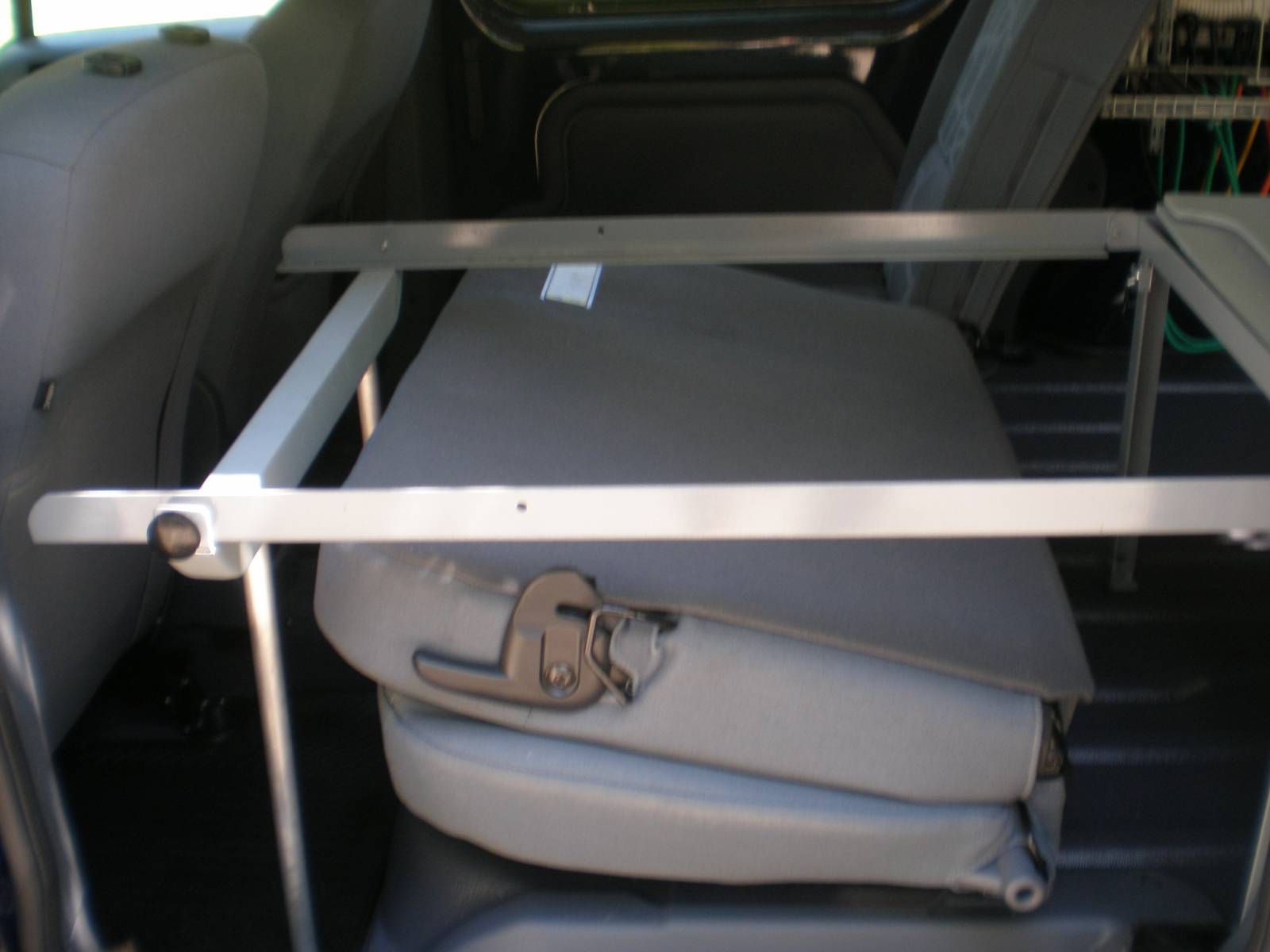 Seat is folded forward and side rails for the lower bed are slid into place and secured with the black knobs located on the bench frame work. Also a support beam has been put into place to suppor the lower bed frame. This two has removeable aluminum legs insterted into a milled 2x4. Just a note where the legs insert into the 2x4 a washer is inserted to keep the legs from etching into the wood at the bottom of the hole. Same for the feet pads.