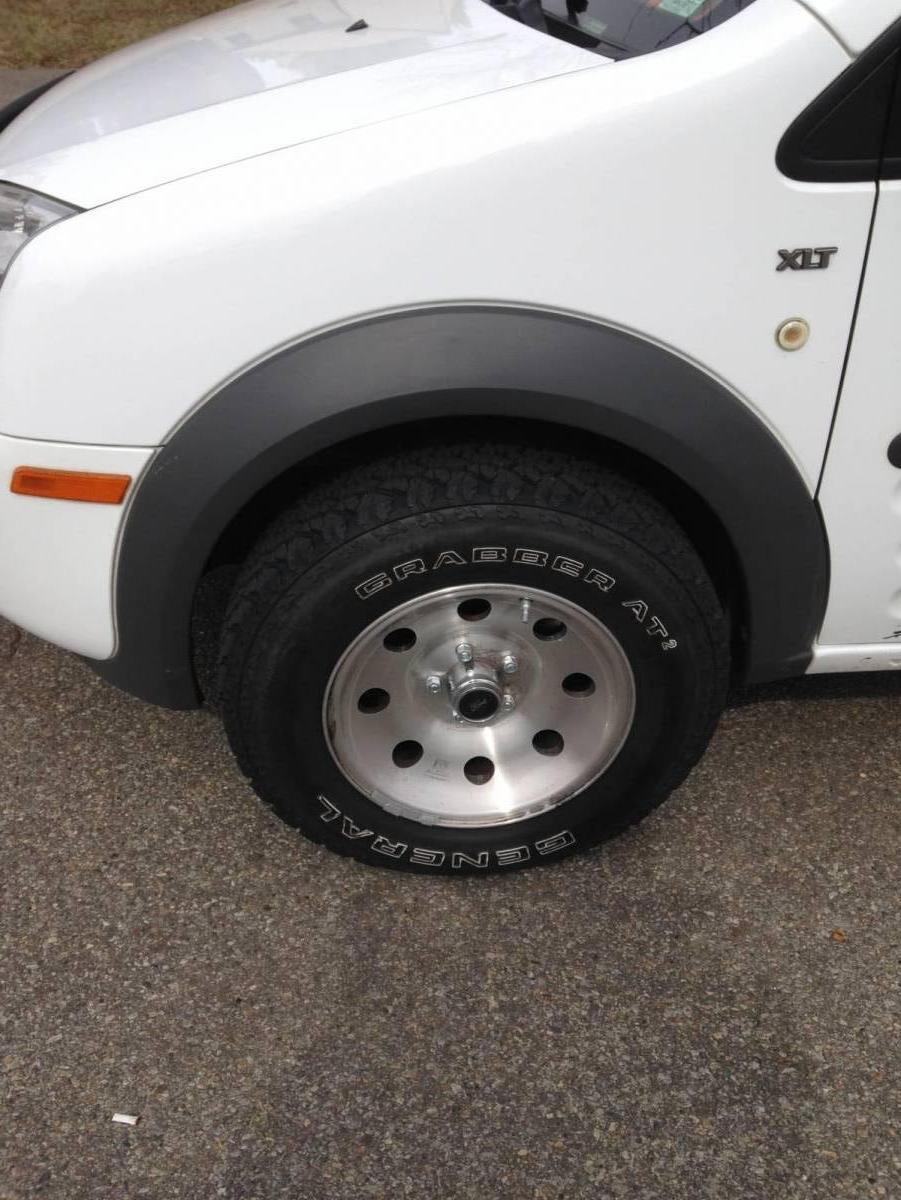 General Grabber AT2s 205/75r15 on Alcoa aluminum rims from my FX4 Ranger. Used adapters to correct the bolt pattern. There is a bit of rubbing on the plastic fender flare, but I am not against a bit of trimming.