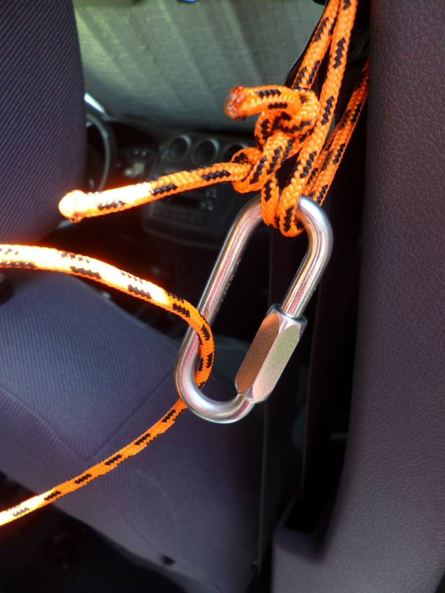 Corner support rope connects to rope/carabiner hanging from seat belt upper.