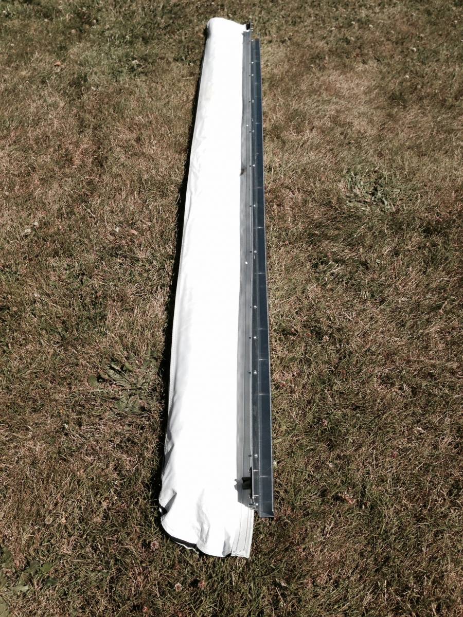 Awning showing aluminum rail that fits over side of roof basket