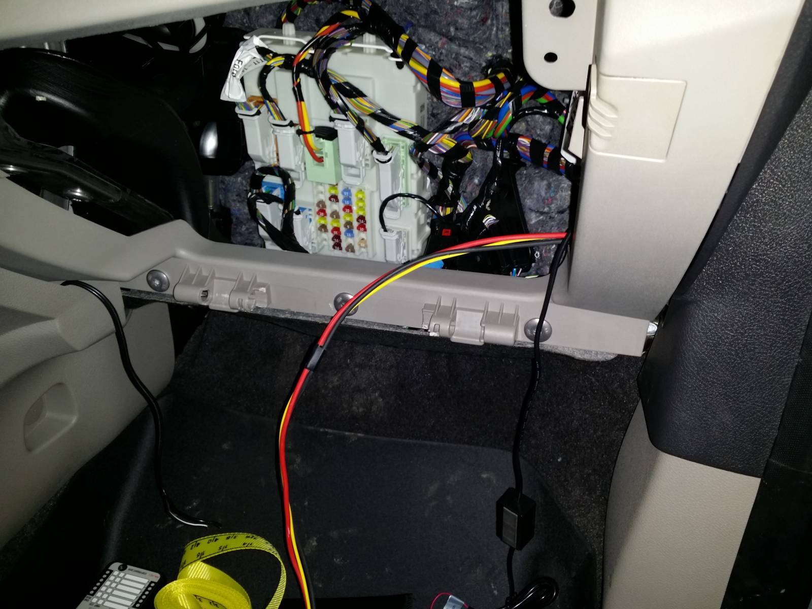 Wiring to FZ-1 FuzeBlock accessory panel exiting behind glove box.