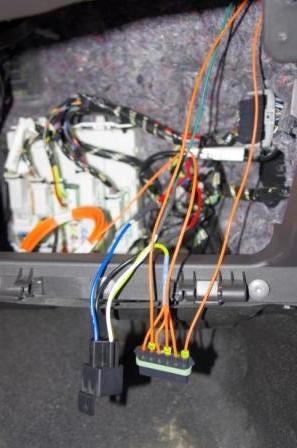 The smaller red wire is from the unused PAM circuit triggers the relay (black relay wire), the Larger red wire (blue on the relay base) is from the battery, both of these wires have inline fuses. The Three outputs (orange wires) are labeled U, L, and R for Upper console, Lower console and Rear.